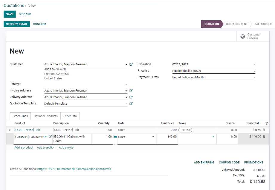 Interfaz de usuario moderna. Toda la información que necesitas y donde la necesitas con una interfaz de usuario rápida e intuitiva, diseñada para vendedores. Envía cotizaciones con solo unos clics. Convierte las cotizaciones en órdenes de venta y facturas desde la misma pantalla. Se integra con la aplicación de CRM para gestionar tu flujo de venta desde la calificación hasta el cierre.